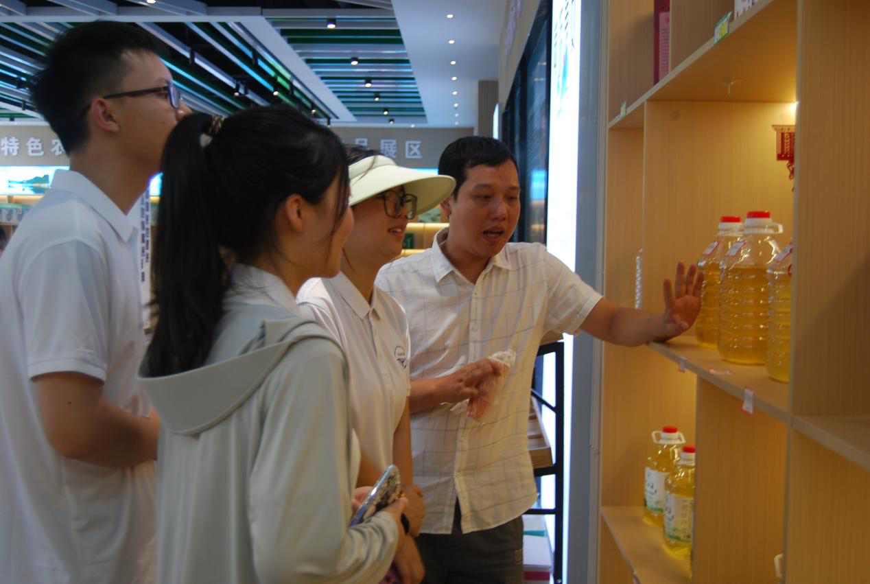 电子商务局负责人欢迎实践团的到来并带领实践团成员参观特色农产品展区、非遗展区等多个不同的商务展区。其中,他重点介绍了东安的特色美食东安鸡、血鸭的销售情况和品牌建设状况。谈及到东岸的酒文化,负责人详细介绍了富有东安特色的酒的种类、制作工序、销售情况以及和酒相关的历史寓言故事。实践团围绕东安县的电商发展状况展开提问。针对实践团所提出的问题,负责人详细阐述了电商人才的培养体系和培养流程、传统农产品在电商平台的销售情况以及电商覆盖范围的大小。结合鹿马桥的特色,负责人分析了产品的包装设计、产品形式和产销现状。随后,实践团成员前往全国电子商务进农村综合示范项目展示区和东安县电商大数据中心参观。通过参观,实践团成员了解到东安县农村电商平台的发展情况和交易状况。