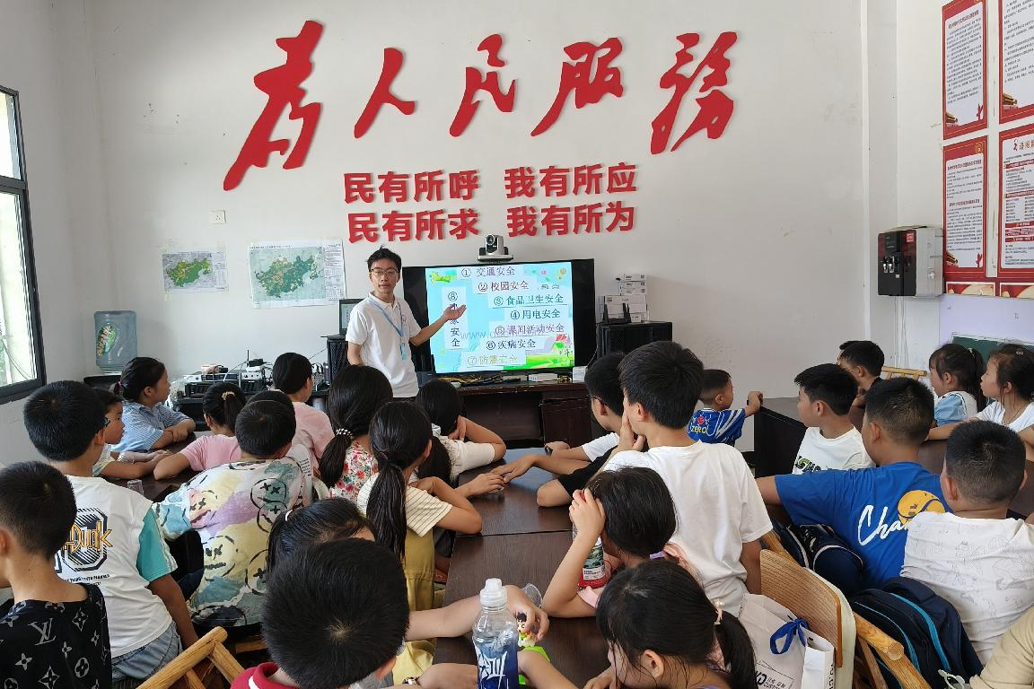 开班仪式上,实践团队长首先向孩子们介绍了实践团的团队构成、实践目标以及简单预告了暑假节目单暨课程安排,同时通过短视频的形式进行团队往期回顾,团队成员依次上台进行自我介绍。随后由课程组两名成员主持破冰游戏,共分为纸巾“炸弹”、数字抱团、数字“炸弹”三个项目。两位成员首先进行规则讲解,每一轮游戏将会决出一名学生上台自我介绍并表演才艺,他们随后帮助、引导与鼓励孩子们有序进行游戏,增进彼此了解。仪式最后,队员针对交通、用电、食品等方面的常见安全问题进行了安全教育,宣讲安全知识,并在课程中设置提问环节,鼓励孩子们踊跃回答。