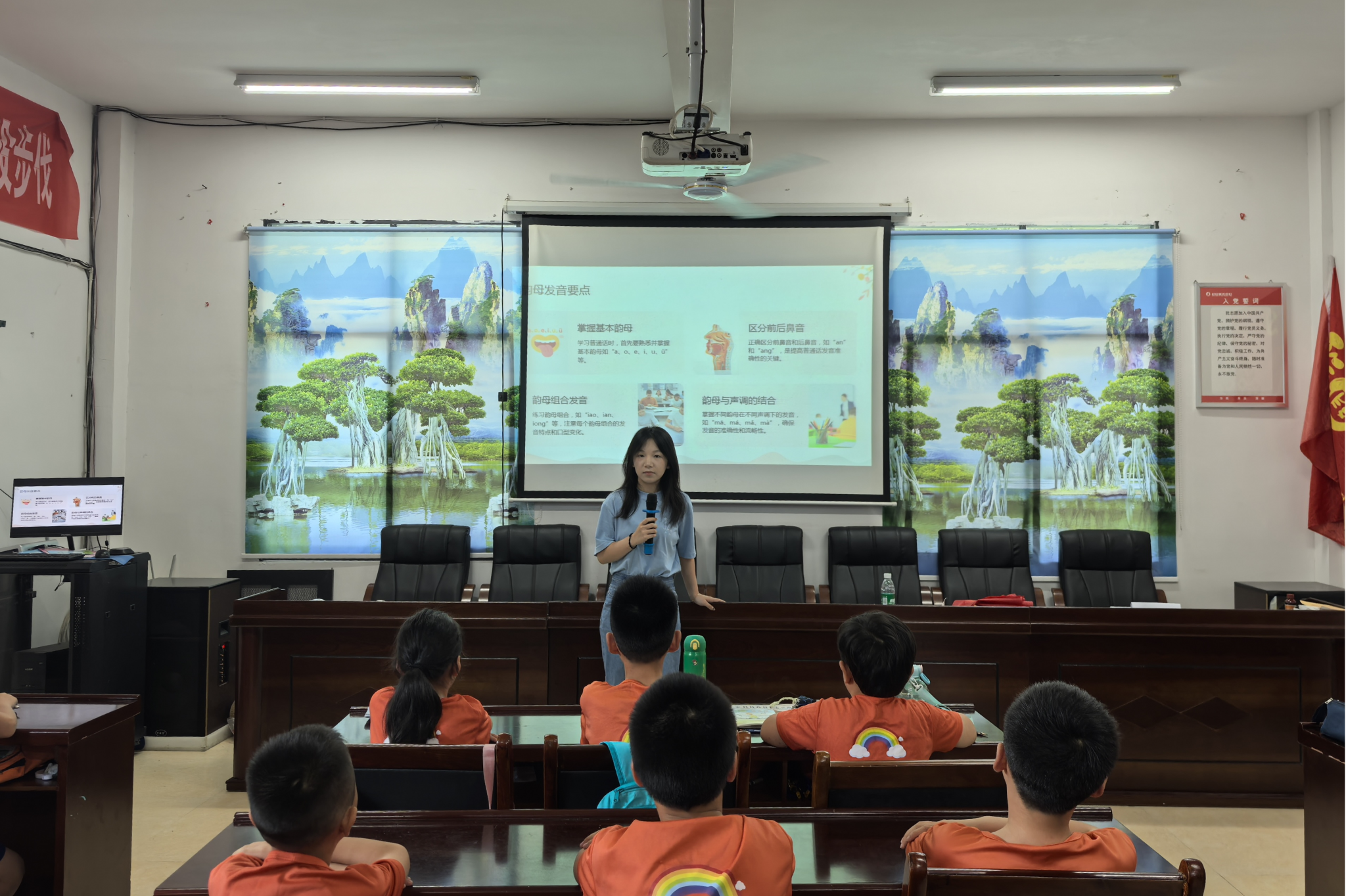 在语文类课程中,实践团成员以普通话推广为主题,结合视频与图片向学生讲解普通话的发展史、普及基本发音知识。实践运用环节中,队员们采取描述图片、接力传话、分组朗诵、方言辨析等多种趣味互动方式,调动学生们参与课堂的积极性,引导学生在讲述中国故事的过程中学习普通话,帮助学生更好地理解与运用普通话。