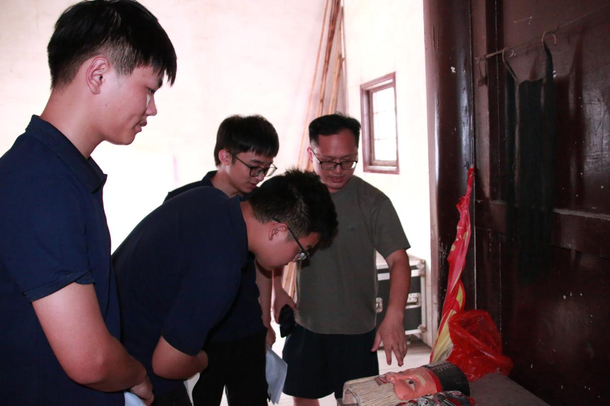 调研组在镇武装部办公室与部长邓庭灿展开座谈,初步了解傩戏发展现状。邓庭灿告诉调研团队,他希望能有更多人了解到水东镇的傩戏非遗文化并对此产生兴趣。为了让队员们深入了解傩戏文化,部长带领团队拜访了当地傩戏传承人,由此深入挖掘这一非遗项目的历史渊源与文化内涵。据传承人所述,临武傩戏所在地大冲乡油湾村的四面环山的独特地形和封闭的生活环境,使临武傩戏世代相传,流传至今。调研过程中,团队详细记录了傩戏服饰、面具等特色文化元素,并与传承人合影留念。