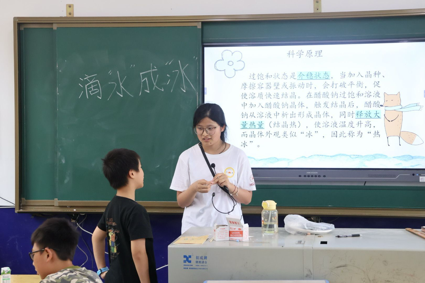 (通讯员 柴本佳 卢俏洁)为拓展暑期“三下乡”活动内容,激发学生对科学的好奇心与探索欲,7月10日,“炎阳”暑期社会实践团成员柴本佳在涟源市湖泉镇湖泉中学开展“滴水成冰的奇妙之旅”趣味科学实验课,暑期夏令营学生参与其中,在动手实践中感受科学魅力,使抽象的物理知识在互动体验中变得鲜活可触。