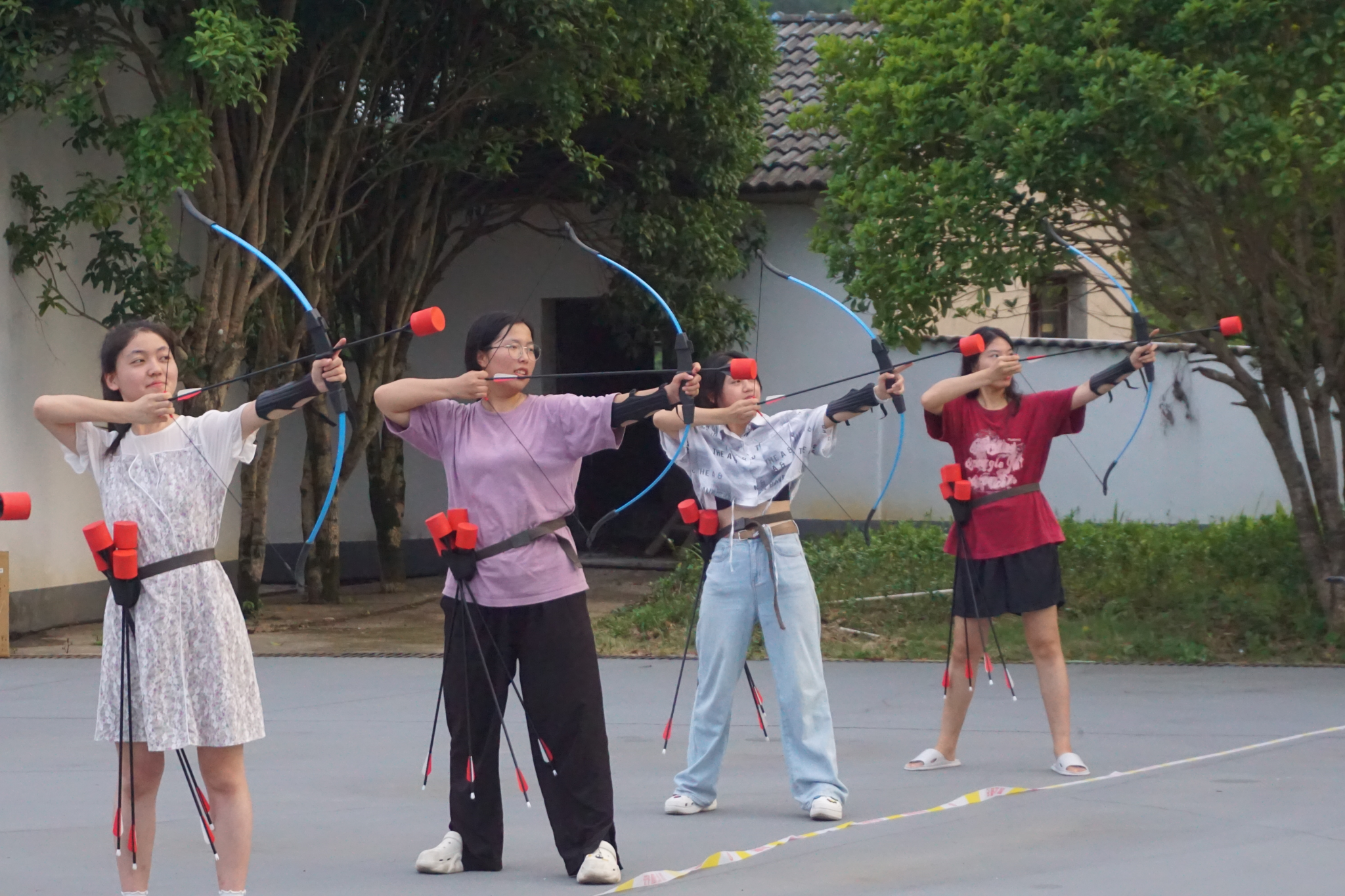 (通讯员 江文慧 程启慧)7月12日晚,威廉希尔中文网站平台威廉希尔中文网站平台“墨韵杨花,文心远扬”实践队在浏阳市杨花乡杨花书院宪法广场,组织攻防箭团体友谊赛。十名女生队员佩戴专业防护头盔,使用安全海绵弓箭,分红蓝两队展开五对五对抗赛。