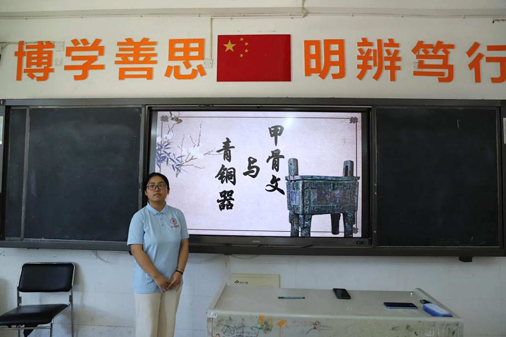 梁艺璇以详实的文献资料、精美的实物图像为引,系统讲解了青铜器从炊具、酒器到祭祀礼器的功能演变过程,引导学生感受“器以载道”的文化内涵。随后,课程重点转向青铜器上的铭文研究,梁艺璇借助动画短片展示甲骨文的起源与发展,用通俗易懂的语言讲解其构字原理。互动环节中,她指导学生识别、临摹“日”“月”“山”等基础字形。这种教学方式使青铜器与甲骨文从博物馆展品变为鲜活的教学素材,让学生深刻体会到了汉字文化魅力。