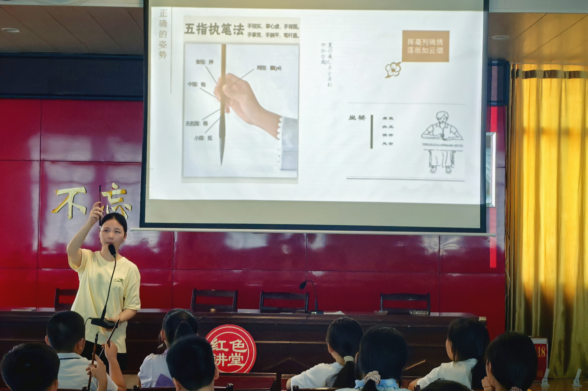 第二堂课由支教组周真宇、郭可纯组织开展书法体验课。支教团队先讲解了书法中五大字体的特点,并通过游戏帮助孩子们熟悉字体特点。随后通过播放科普视频的形式,带领孩子们了解墨水的起源。最后由郭可纯在纸上进行示范,帮助孩子们体验书法的乐趣。