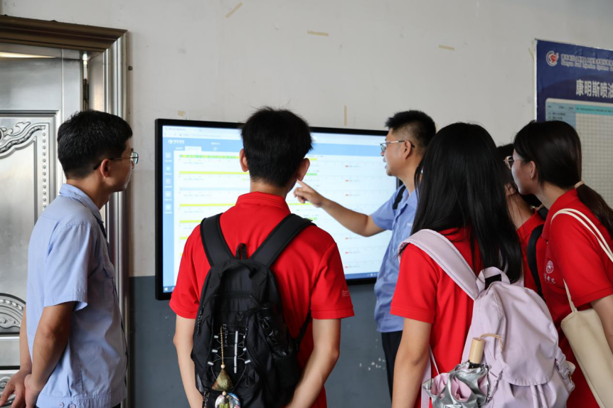 在信息中心主任张凡的引导下,实践团成员实地考察了现代化的共轨车间。张凡现场演示了智能化产线的运作流程。团队成员了解到,通过物联网技术的广泛应用和AI质检系统的精准把关,生产线的效率和产品质量均得到了显著提升。