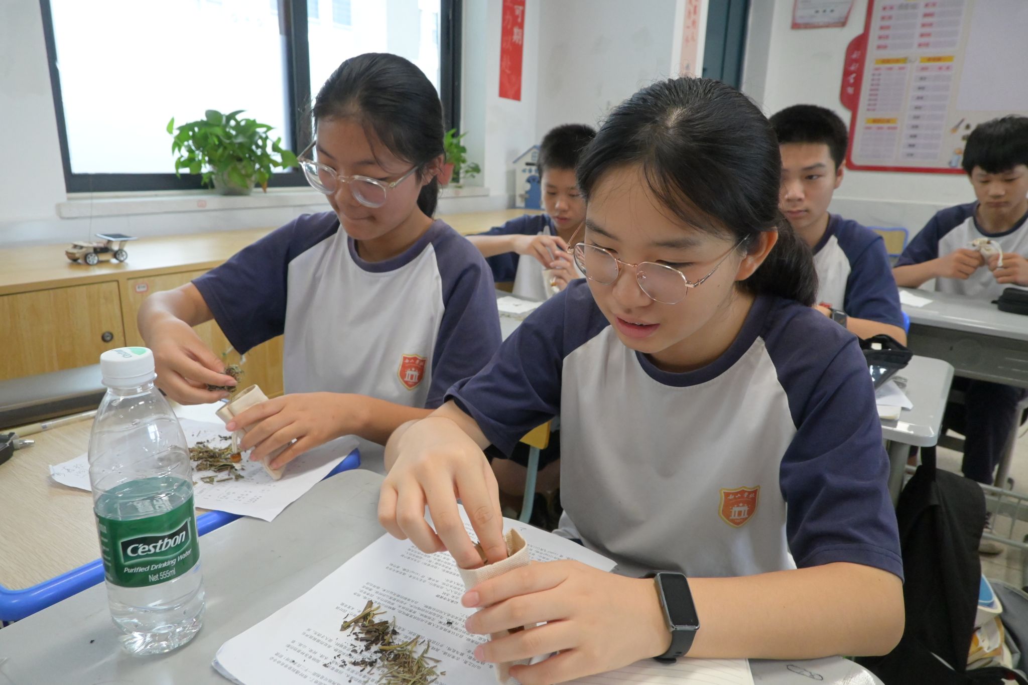 课程从解析中药名称渊源切入,主讲人介绍了尿床草、何首乌、忍冬这三种药材得名的缘由。为阐述中药理论基础,主讲人以黄连清热、乌梅收敛等中药特性为例,说明了寒热温凉四气属性与酸苦甘辛咸五味功效的临床关联。以麻黄配伍桂枝为例,主讲人阐释了君臣佐使的组方逻辑。主讲人还介绍了动物源性药材的应用,包括阿胶补血滋阴、蝉蜕缓解风热惊厥、蜂蜜润燥通便等案例。针对现代中药应用,主讲人通过对比板蓝根颗粒和添加大青叶的复方板蓝根颗粒的不同功效,提醒学生应该依据国药准字Z代表中成药、国药准字H代表化学药的标准区分药品类别,建议学生选用药准字产品而非保健品。实践环节中,学生利用主讲人分发的中药材,分组制作了驱蚊型、提神型、安神型三类功能的香囊。在课程总结阶段,主讲人提到了中医药在当代面临的传承挑战,呼吁青少年群体主动参与传统文化传承。