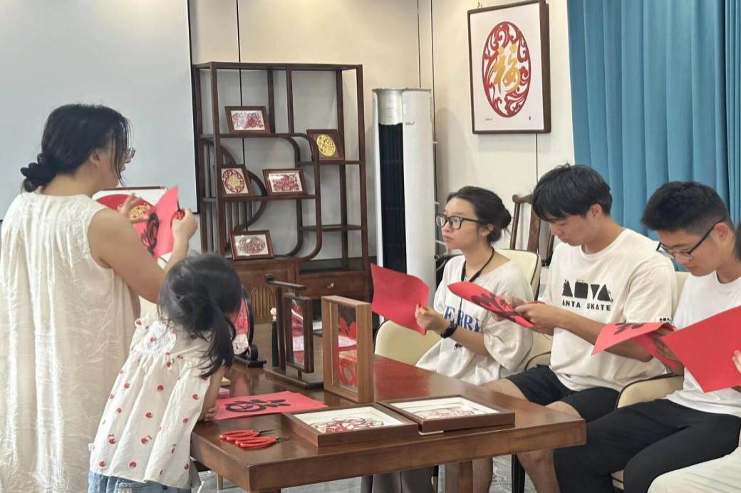常宁剪纸拥有五百年的历史,艺术造型与剪法技法上已形成成熟体系。常宁剪纸发展至今,已形成丰富的艺术特色,锯齿纹、月牙纹、纺锤纹等纹样精巧;双铰、单铰、零铰等技法多变。衡阳市级非遗项目传承人、常宁市剪纸学会会长刘丹向调研团展示馆内优秀作品。在刘丹的指导下,调研团成员从纸张折叠技巧入手,学习基础的双铰对称剪法与单铰自由剪法。成员们跟随刘丹的示范,创作自己的剪纸作品,感受传统剪纸技艺的魅力。