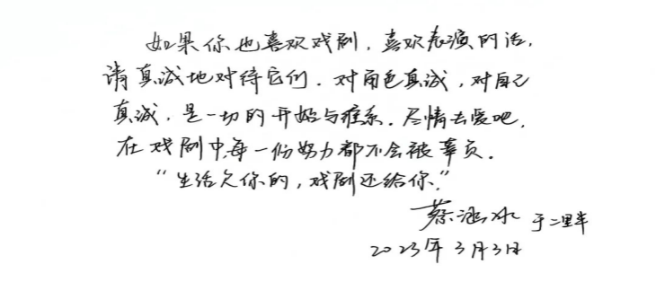 “我们的理想应该是一直为艺术中那些永恒的、永不磨灭的、永远年轻并贴近人心的东西而奋斗。”她很喜欢《演员自我修养》中的这句话,并将之作为自己的理想与信念。她说,戏剧是她决心走下去的道路,她从中看见、听到、触碰、感受,每一个瞬间都是纯粹而幸福的。她也希望可以将这份独属于戏剧的感动通过作品带给更多的人,愿大家都可以成为永远疯狂、永远浪漫、永远清澈的存在。